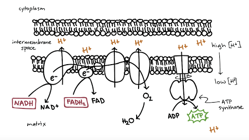 By this I mean the energy used to create ATP can only be harnessed on the low-energy side of membrane Im guessing on this last sentence. The electrons from from NADH and FADH2 flow through the electron transport chain in the inner mitochondrial membrane generating a H buildup in the inner membrane space. The proton gradient produced by proton pumping during the electron transport chain is used to synthesize ATP.